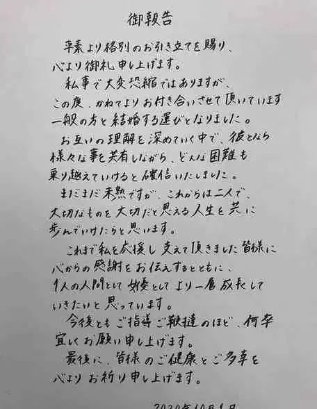 据说石原里美与现任老公是在朋友的助攻下相识,对彼此初印象很不错。经过一段时间相处,惊喜地发现两个人的爱好、观念都特别契合,而且男方的家庭让她感觉到了温暖平和。都认为,遇到个对的人不容易,于是在一年的短暂接触后,2020年两人就决定步入婚姻的殿堂,正式成为一家人。公布婚讯时,石原里美还特别晒出了手写信。