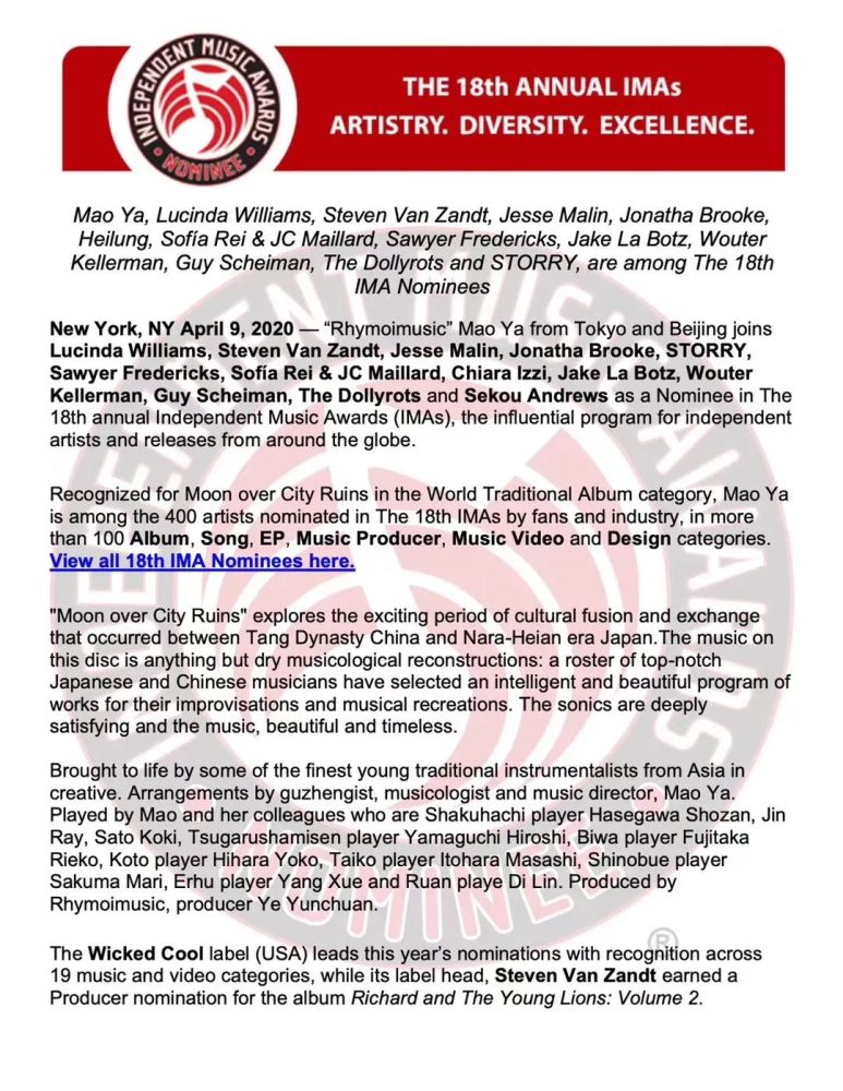 美国Independent Music Awards(IMAs)独立音乐奖由Music Resource Group (MRG)于1999年创立的国际性音乐大奖。它授予全球顶尖独立艺术家(音乐人)以殊荣,评奖范围涉及全球70多个国家的独立艺人或独立音乐厂牌,评选约70个大奖。