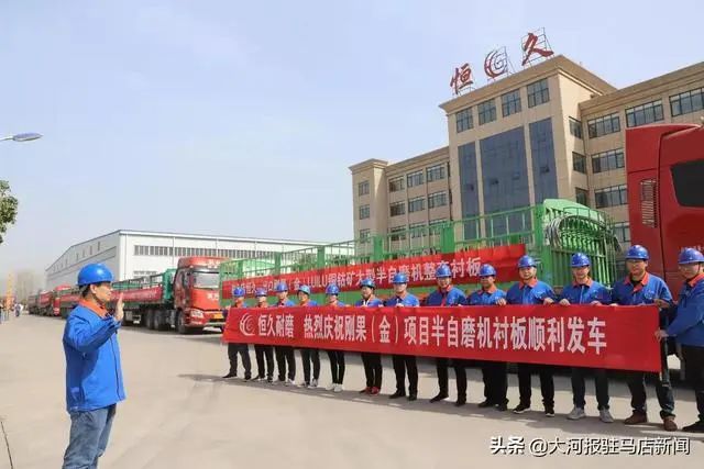 前不久,走进位于确山县产业集聚区的驻马店恒久新型耐磨材料有限公司,闯入眼帘的是一番喜人景象:五辆满载远销非洲刚果(金)的一批订单产品恒久半自磨机衬板的大型货车一字排开,整装待发。“驻马店恒久——出口刚果(金)LUILU铜钴矿大型半自磨机整套衬板”红色横幅格外醒目,工人们正忙着为产品做最后的检验,并给货车披戴了大红花,共同预祝顺利发车,安全抵达目的地。