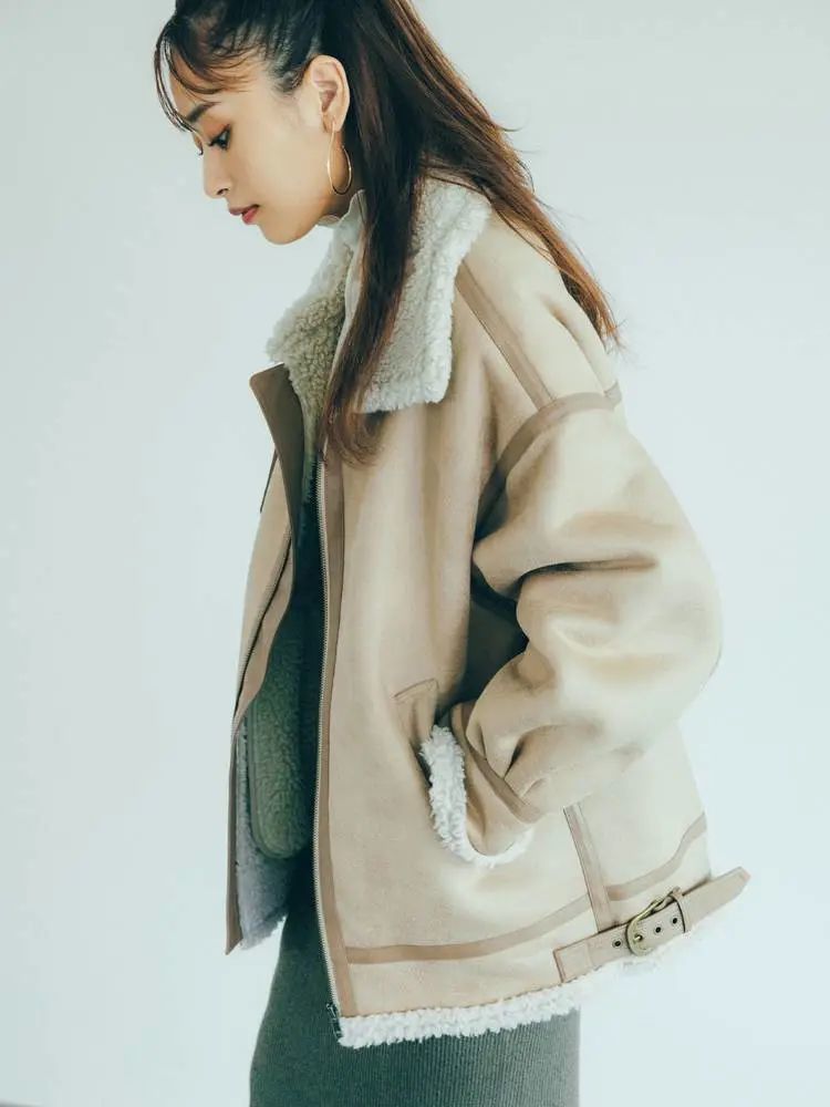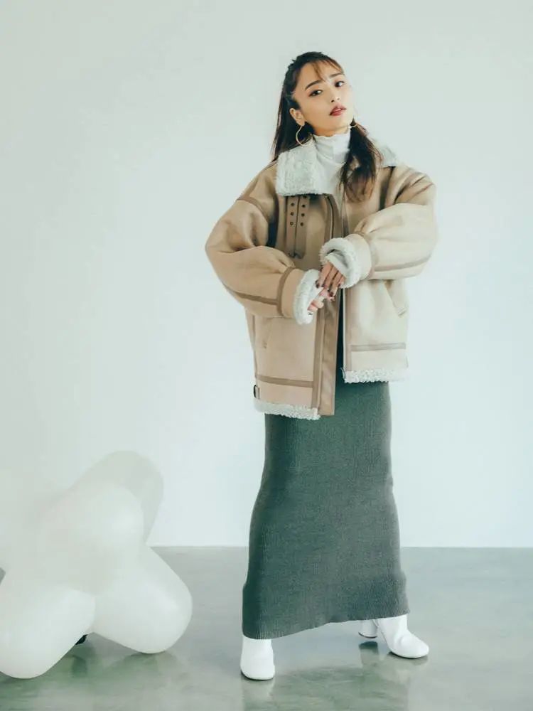 机车外套是妥妥的硬汉机车风,搭载了分量十足的羊羔绒面料御寒又增添了几分萌样,内搭女人味爆棚的长款半裙,街头混搭范儿十足。