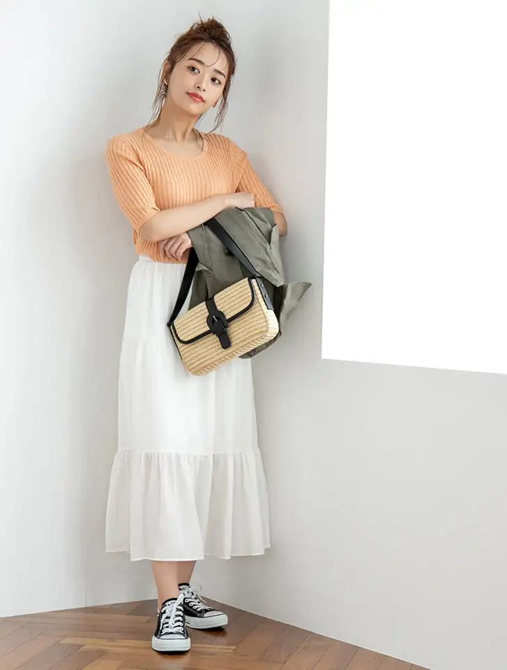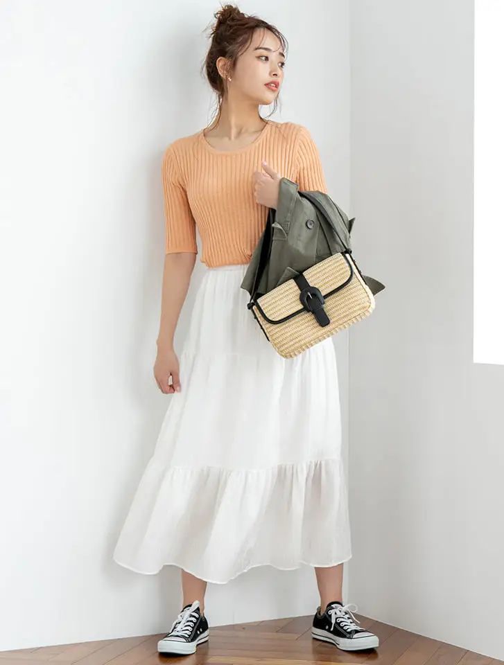 淡彩的粉橘色V领针织衫色彩别致,尽显潮流腔调,再加上仙女风白色纱裙的演绎,奠定整体LOOK的优雅格调,用文雅的方式来阐述女人的浪漫风姿。