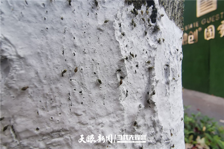 记者看到,这些小虫子体长1至2毫米左右,在树干上十分活跃,树干下方的落叶上,也有发现。