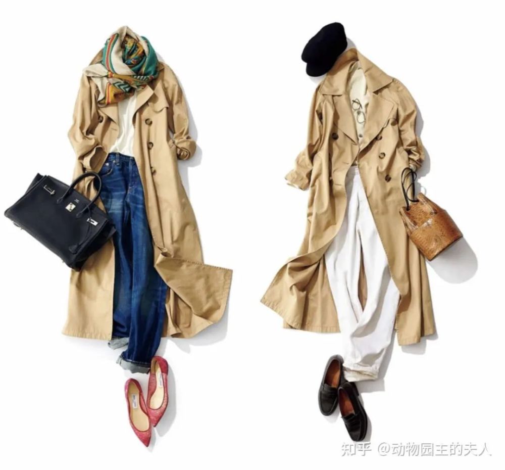 这件风衣更休闲的穿搭也可以加入一些很摩登的元素。比如图中,长裤变成白色或者丹宁色的仔裤。如果想更时尚一点参考左1的红色镂空单鞋,而右1则是很帅气的中性风,只是把配饰换成了乐福鞋。再看两套搭配用到的其他配饰,比如第一套就很能展现女人味的印花丝巾、第二套则是很帅气中性的黑色鸭舌帽,不同的风格应对不同的场景。