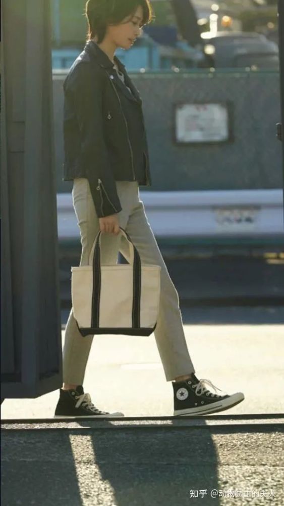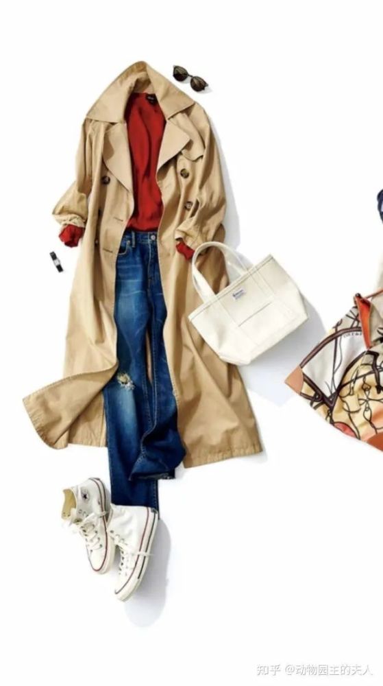 风衣外套的另外一个功能,还可以作为旅行、出差这种场景的必备单品。比如Emiri这一套内搭换成了更适合春游的红色针织衫,脚下是非常舒服休闲的匡威,包括包包也是帆布包,这一套比起之前的搭配更轻松、更轻便,适合旅行和带孩子出游。
