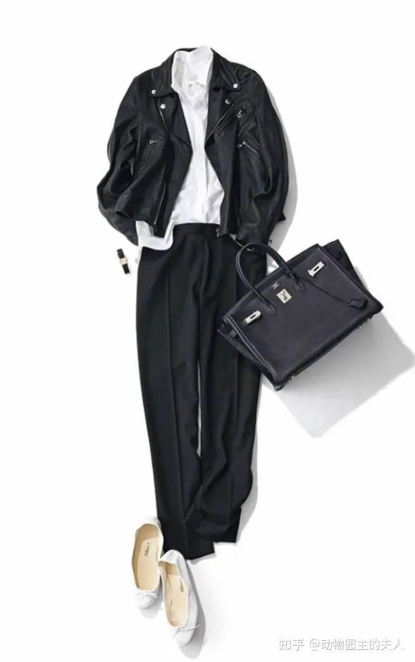 像Emiri这件机车皮衣本身就是冷酷时尚的代名词,所以如果想走酷甜的风格,就可以参考这一套配色,简单又冷酷。黑色的皮衣+黑色的西裤,中间用白色的衬衫作为过渡,鞋子可以选择芭蕾舞鞋,让整体的搭配在中性冷酷中透露着一点点女人味,而且她的首饰也选择的用心很多,卡地亚的腕表和奢华的爱马仕包包。