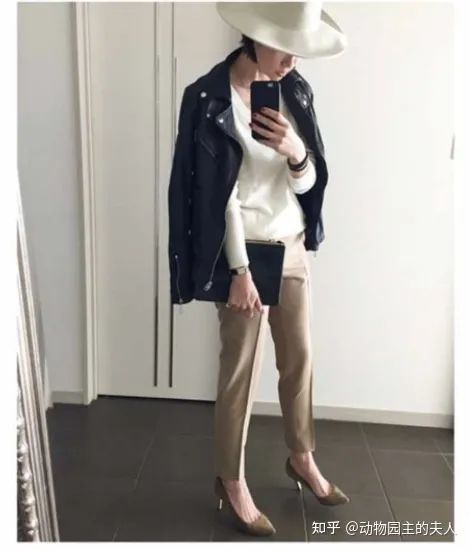 第二套机车皮衣搭配就比较休闲和优雅了一些,内搭换成了套头衫,加入了Emiri的代表性配饰牛仔风格的礼帽,而且换成了很女人味的高跟鞋,这一套也适用于工作性质比较时尚摩登的女性参考。