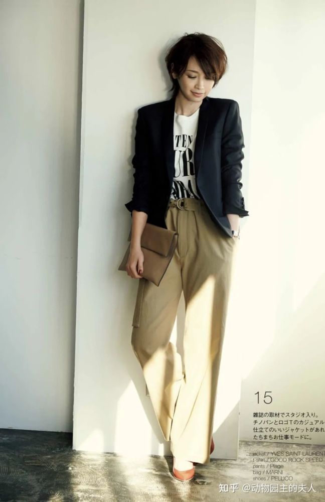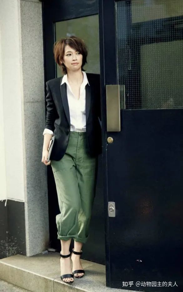 还是这件黑色的西装,这次下面的单品换成了军绿色的休闲裤,Emiri将裤边随意慵懒的卷起来,内搭了白色的衬衫,整体印象是帅气中性风,但是也不失活力满满的氛围。