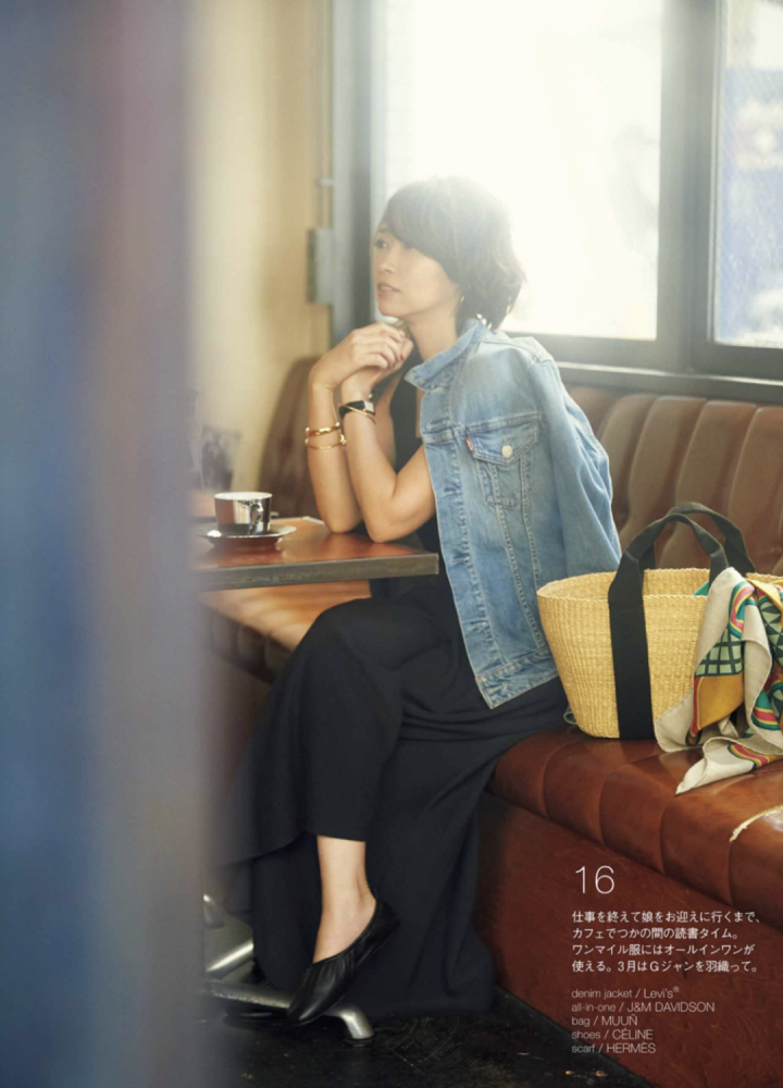 Emiri的牛仔外套,一共有三件,分别是这件天蓝色的外套,还有一件是藏青色的和白色的。我比较中意这一件,很适合我们黄皮肤的人。Emiri的这件蓝色牛仔外套搭配很有氛围感,其实她里面是一件很舒适的黑色连衣裙,因为她个人身材比较趋向于S型,所以很适合穿裙装,我呢个人就比较喜欢内搭条纹T恤和黑色阔腿裤,更舒服适合上班,方便活动和行走。