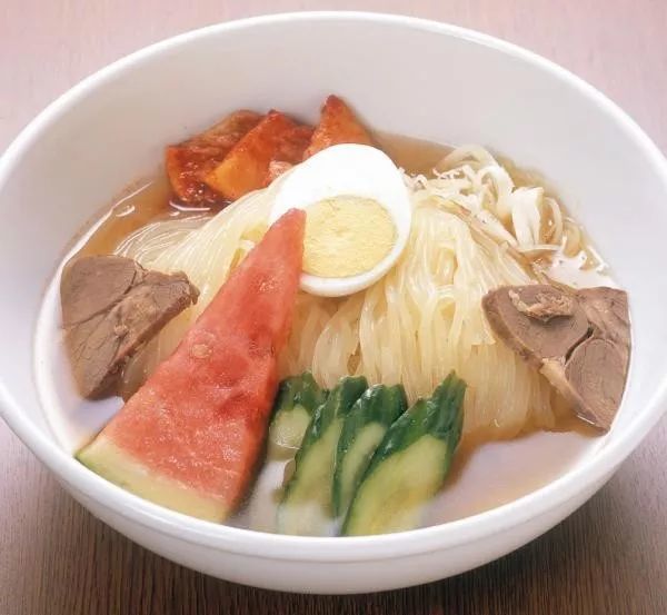 与韩国料理中的冷面不同的是,面中添加了荞麦粉。因此,它具有独特的口感,颜色和柔软度类似于稍暗的荞麦。盛冈凉面的另一个特点就是可以选择汤的冷热程度。