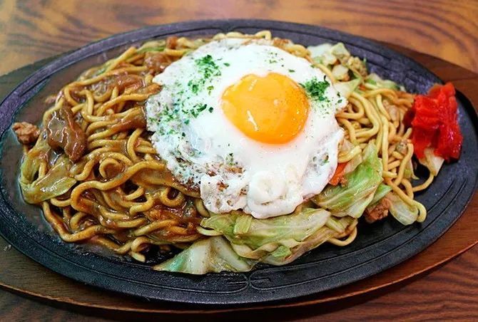 横手炒面是所有炒面里最具代表性的了!其特点是,使用很粗的面条进行烹制,最后再加上点睛之笔--半熟的煎鸡蛋,