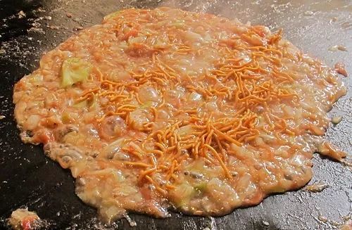 しぐれ焼き使用了富士宫很有嚼劲的炒面又结合了文字烧,这是一道两种食物混合在一起的美食。