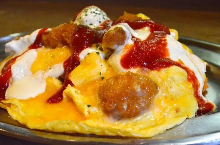 非常好吃的蛋包饭,用黄油米饭做打底,上面放有炸鱼排,最上面铺上一层半熟的蛋液,最后再放一些蕃茄酱做点缀。