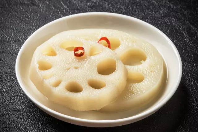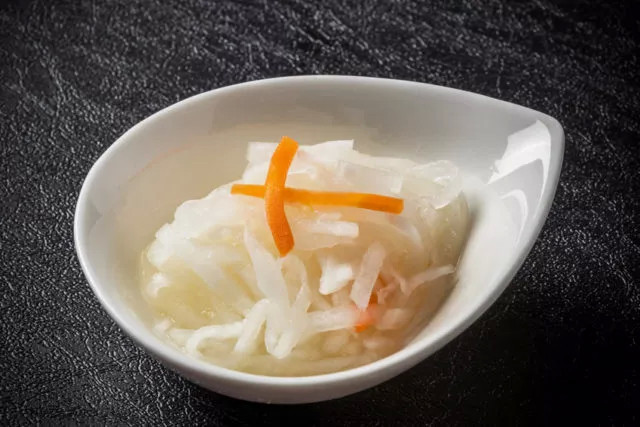 红白芜菁用醋腌制,并做成菊花形状,极为好看的同时,菊花在日本有祈求邪气退散和长生不老的吉祥寓意。