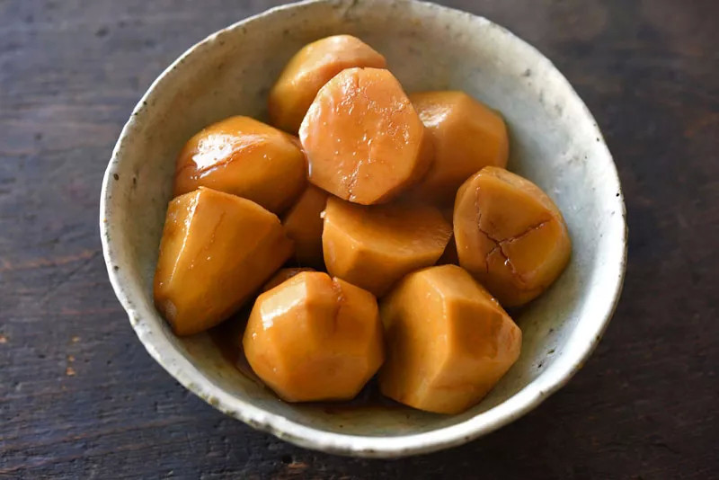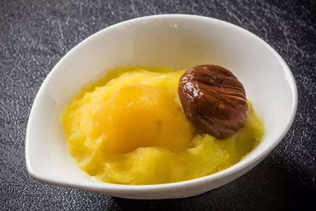 糯米和栗子组成的黏黏甜甜的饭团。如金子一般的颜色在加上有“胜栗”象征的板栗,因此有财源广进,发财的寓意。
