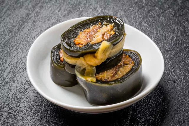 海带与鱼肉的组合。里面的鱼肉代表子孙满堂,海带在日语叫做昆布,发音跟“欢喜,开心”的单词很像,因此用“开心包裹小孩”,寓意长生不老,是很吉利的意思