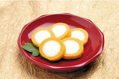 将鸡蛋的蛋黄和蛋白分开来,分别调味后以上面是黄色下面是白色做成的料理。黄和白的两种颜色被比喻为金和银,放在年节菜中,同样也是具有发财的含义