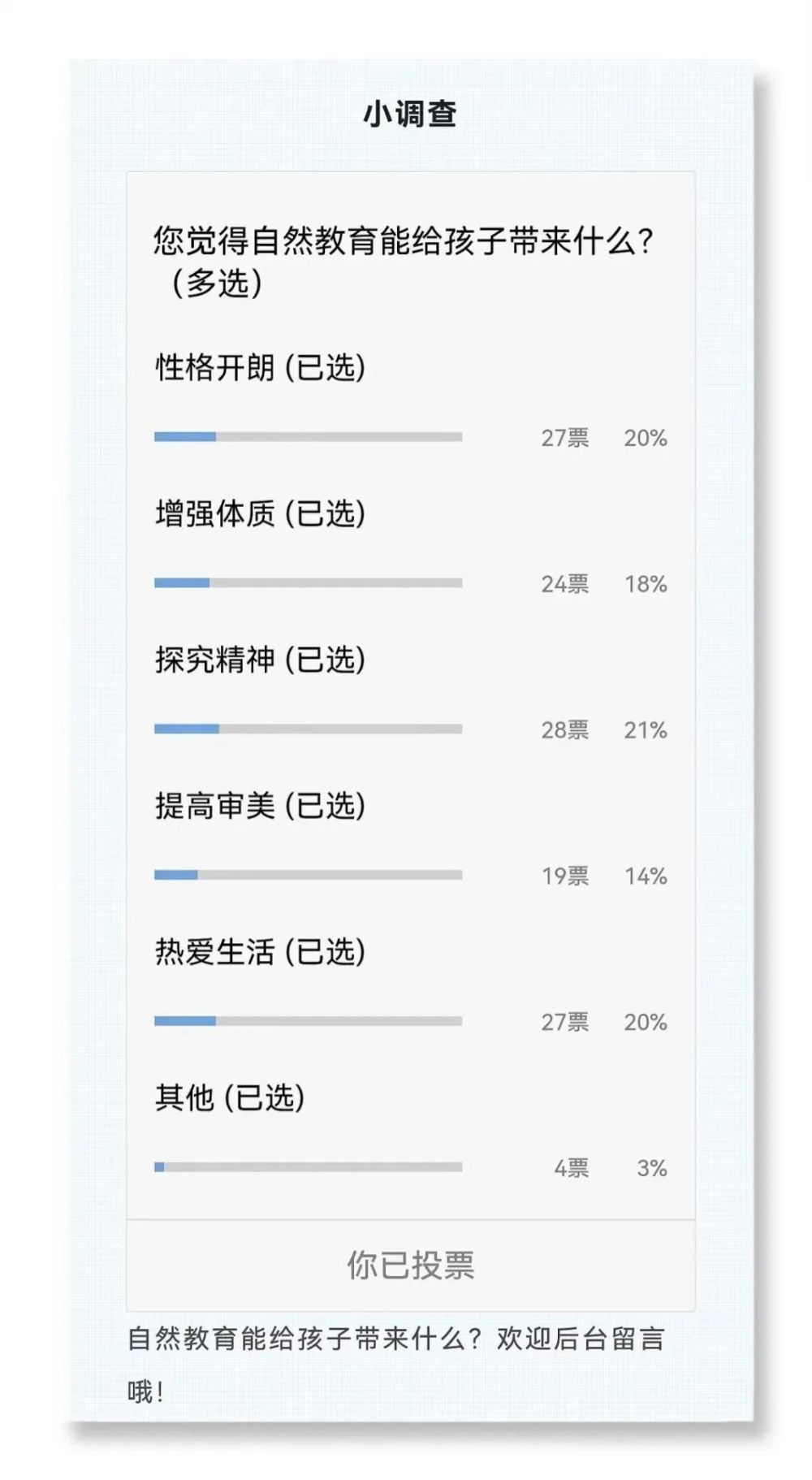 显然,家长们对于自然教育的认同度很高,自然教育几乎涉及到孩子成长过程中的方方面面,不论是对于增强体质、启智心灵、培养能力等,均有很好的作用!