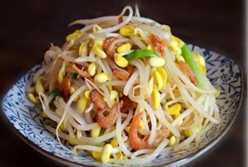 开旺火,冷锅下油,加入姜丝、虾米煸炒一会,再加入择好的绿豆芽快速翻炒,加入少许的醋炒制熟透,加盐调味即可。