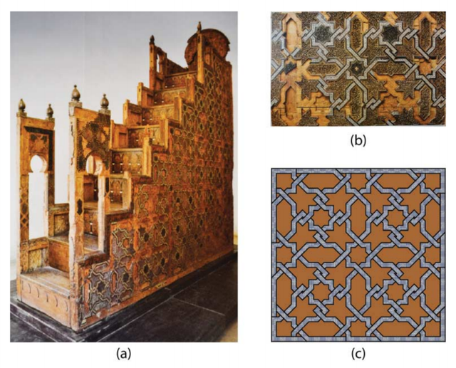 多边形的星星,一种常见的伊斯兰花环,出现在10世纪的科尔多瓦大清真寺和科尔多瓦哈里发国的后艺术中。清真寺的圆顶与环环相扣的肋骨形成一个八角星(图3)(点群:D8或8mm)。它也是11世纪Almoravid统治时期几何装饰的基本图形之一(图4(a))。六边形对称6mm的线性装饰(图4(b))和4mm或422(如果我们考虑交错)的线性装饰(图4(c))出现在同一时代。