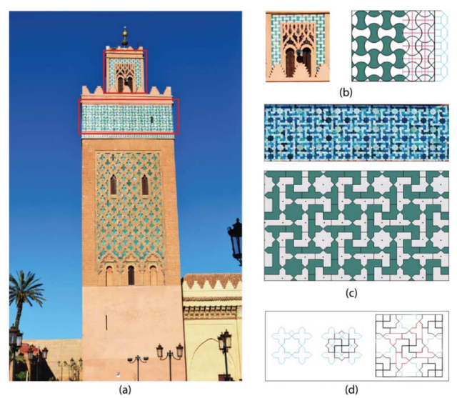 Qasba尖塔显示了另一种八角形图案的亭子(图23(b))。此外,一条带有更复杂的纳粹党所用十字记号图案的宽条带,具有p4对称群,装饰着立面的上部(图23(c))。如图23(d)所示,该图案是通过使用所罗门印章对平面进行初始密铺而获得的。在10世纪和13世纪之间,现有的晶体群是cm、cmm、p4、p4gm、p4mm和p6mm,p4mm是最常见的。