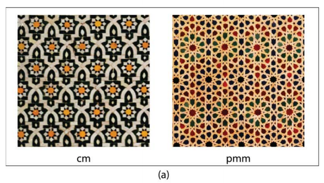 重复平移模式的无限延伸的感觉是我们在晶体学中发现的一个概念,其中晶体在三维中具有平移对称性,并被假设为无限。自9世纪以来,该平面的晶体群的数量和复杂性已经发生了变化。然而,摩洛哥工匠无法建造费多罗夫的17个群。缺少对称群的原因可以解释为,工匠们已经达到了设计其他对称群的能力极限(他们没有对称群的知识,或者他们没有复杂的工具),或者是因为他们偏爱某些对称而忽略了其他对称。然而,最近已经通过使用CAD工具和Hasba方法建立了丢失的群。