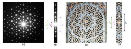 图29 (a)准晶AIMn的衍射图样(R. Portier);(b) (a)所示的衍射的中心子午线,(c) Madrasa Attarine (非斯)的准周期Zellijs图案,(d) (c)所示的准周期密铺的中心子午线截面。相对于中心的对称元素l2/l1 = l3/l2 = 1.667(黄金比例的近似值r = 1.618033 .....)。