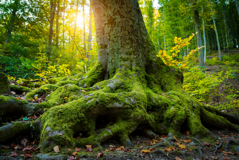 清晨沿曲径南行,树木成林,日出林梢,明暗相间。