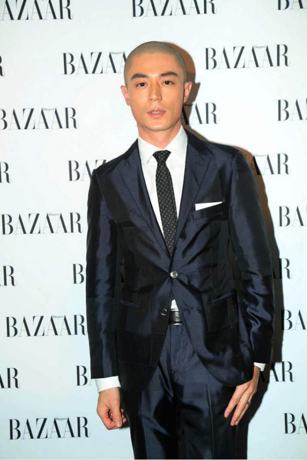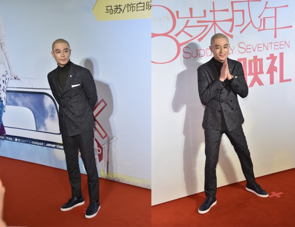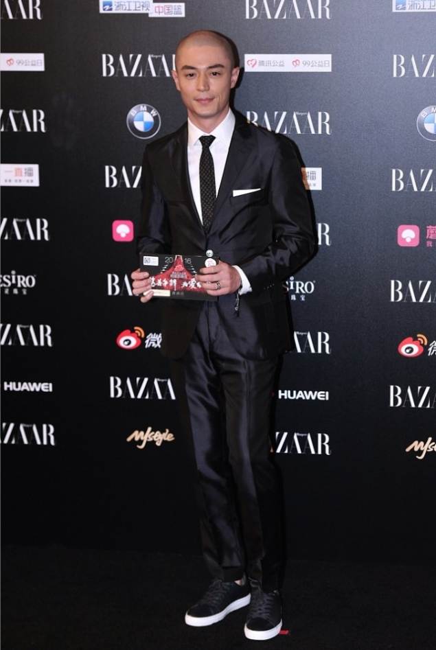 因此也不得不说,霍建华留光头颜值也在线,配黑色亮面西装雅痞十足,真有男人味。