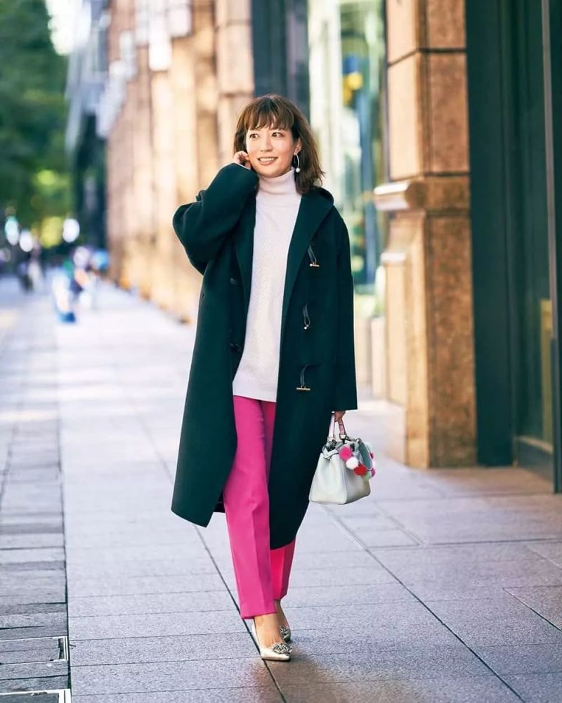 大日方久美子的搭配也是多以纯色为主,尤其是黑白橘朵,不过即便这样她也会挑一些设计感比较有意思的,比如面这一身,侧面的设计别致很多。