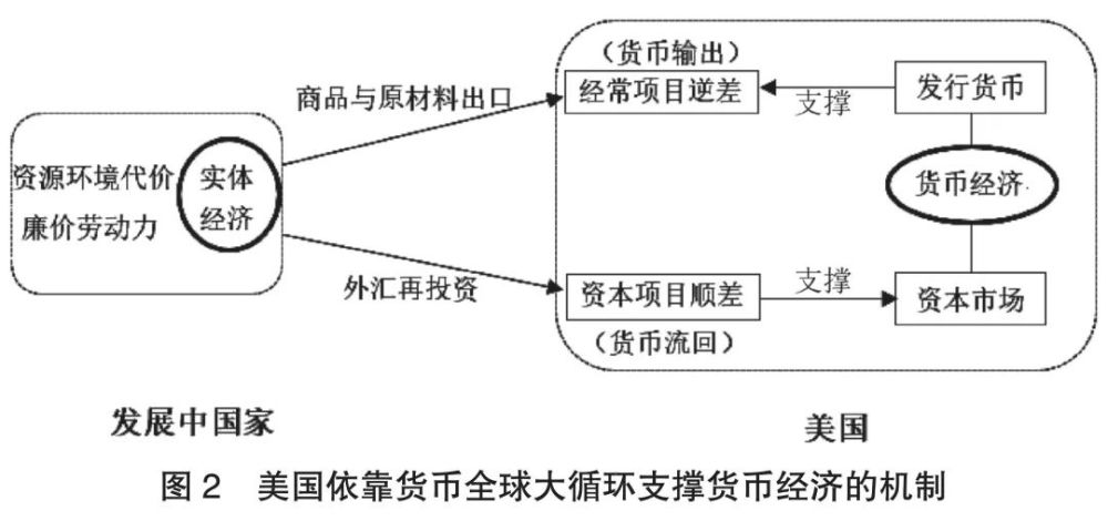 美国过去能够维持虚拟化的货币经济,很大程度上是靠美元在全球范围内的大循环,即一方面,美国凭借其世界结算货币的地位,靠发行货币支付经常项目逆差,对外输出美元;另一方面,通过发展中国家的外汇再投资,美元又回流美国,支撑其国内的资本市场。在这种体系下,美国凭借其军事优势和货币强权向全球“剪羊毛”、收取“铸币税”。而发展中国家却为此付出沉重的资源环境代价,以及压低劳动力成本所产生的社会代价(见图2)。