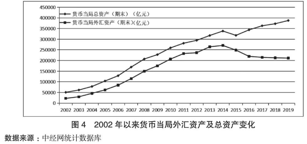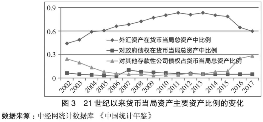 在融入全球化的过程中,中国逐渐形成了锚定外汇储备的货币发行制度。在货币当局总资产构成中,外汇资产占比最高时超过80%(见图3)。当中国基础货币发行主要依据外汇储备时,货币发行就会被动地随外汇的变化而波动。