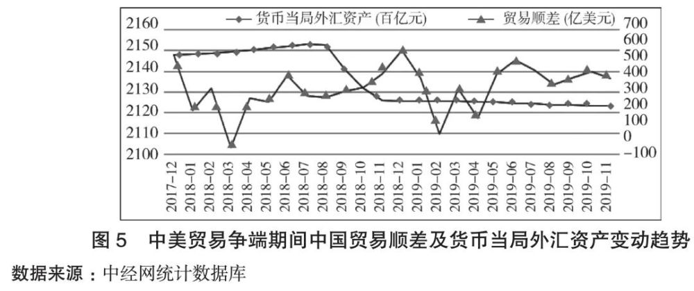 2018年以来,先是美国单方面相继发起对华贸易战和科技战;2020年遭遇新冠肺炎疫情全球大流行后,全球产业链又受到严重冲击,世界各国经济陷入不同程度的衰退。对中国产生的直接影响就是出口剧烈波动,这一方面会使经常账户下的贸易顺差减少;另一方面,出口波动会直接传导到国内出口行业,相关企业会面临市场萎缩、经营状况恶化的困境,加上国内疫情的前期影响,大量企业特别是FDI企业投资可能会流失,这会造成资本账户下的外汇流失。如此,经常账户和资本账户就会同步发生外汇大量流失(图5中,中美贸易争端期间贸易顺差急剧波动,货币当局外汇资产持续下降)。