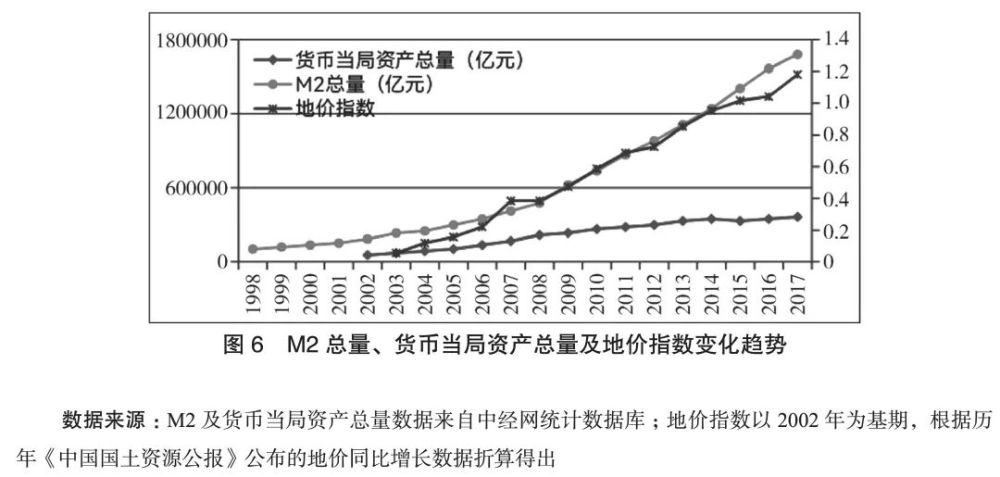 一方面,被动增发基础货币本来会带来国内高通胀风险,而中国之所以没有发生恶性通货膨胀,原因就在于国内形成了土地这个吸纳货币扩张的“锚”,房地产成为吸纳增发的广义货币的主要领域(见图6,地价指数与M2总量同步增长,远超过货币当局资产总量增长速度),同时也带动资产价格虚高、产生泡沫化问题。