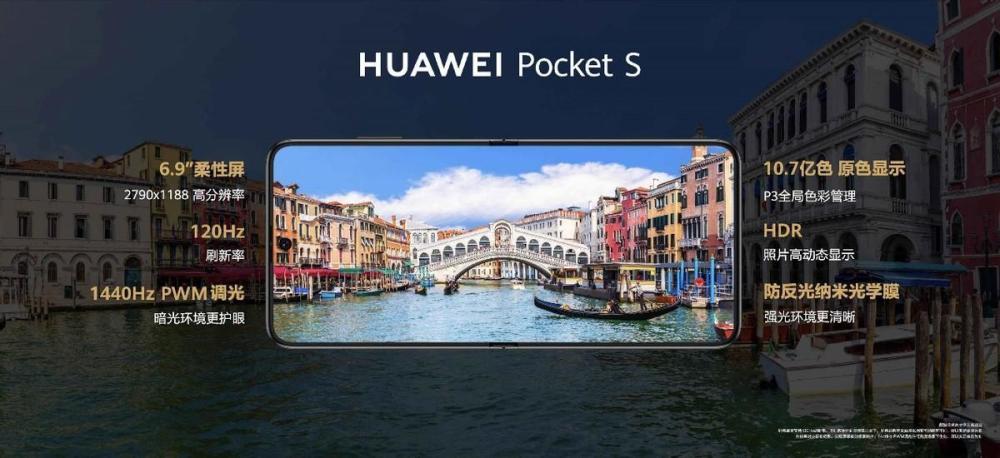 在屏幕配置上,华为Pocket S拥有6.9英寸沉浸大屏,21:9观影比例,配合442ppi、10.7亿色和P3广色域色彩管理,真实还原色彩,显示细腻。屏幕支持120Hz刷新率和300Hz触控采样率,显示流畅、触控精准;1440Hz 高频PWM调光,暗光环境更护眼。华为Pocket S还支持HDR Vivid视频显示,色彩及层次更丰富,明暗对比更强,为用户带来真实的临场感。同时还采用了防反光纳米光学膜,在阳光下也清晰。