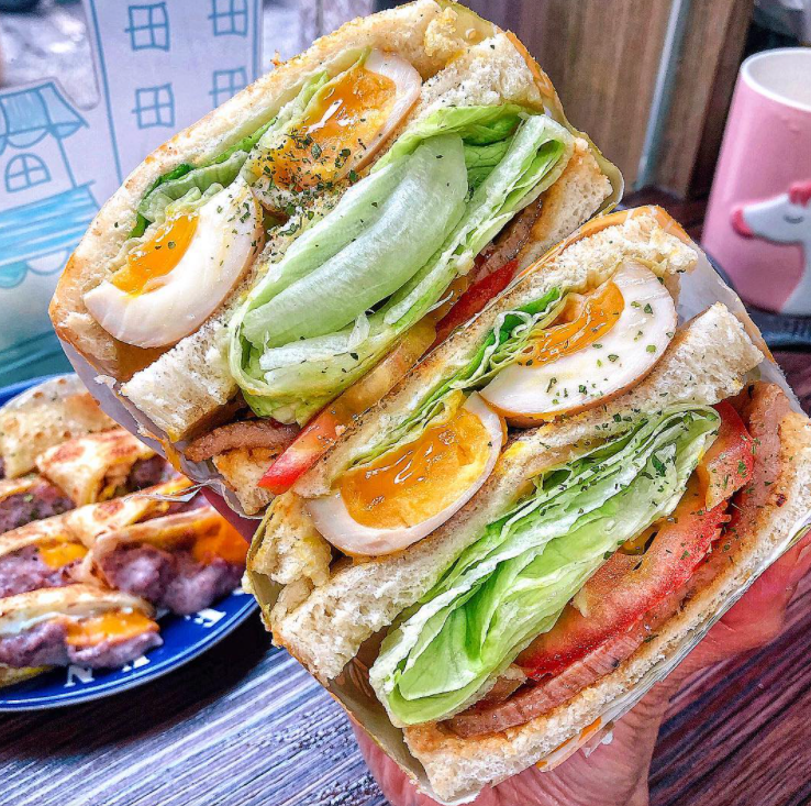 阿嬷私房辣菜脯溏心猪排蛋吐司,溏心蛋加上满满的配料,里面还有涂抹花生酱,超级丰富,不愧是限量