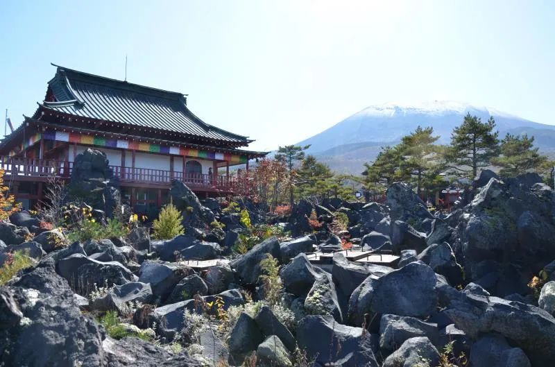 浅间山海拔2568米,为日本最活跃的火山之一,与周边四阿山、白根山等总称为浅间乌帽子火山群。山北麓有鬼押出园,这是1783年浅间火山喷发时留下的一片长约12公里、宽约3公里的黑色熔岩,因熔岩形状丑恶如鬼怪出没,故得名。熔岩间被岁月腐蚀而成的黑土上,开放着各种色彩艳丽的野花,松树从嶙峋熔岩上顽强地钻出,迎风伫立。