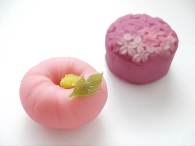 从外型来看是小小的粉红色麻糬,通常里面会放红豆馅,然后再用盐渍的樱花叶包起来。樱饼在关东和关西的外观稍有不同,在关东被称为「长命寺」(下图左),面粉揉成的皮经烤后卷起包覆内馅,宛如薄可丽饼般。而在关西则称为「道明寺」(下图右),类似馒头形状的饼,使用道明寺粉(将浸泡在水中并蒸熟的糯米干燥后再粗磨成的粉类食品)制成,因此口感会有一粒一粒的细碎感。