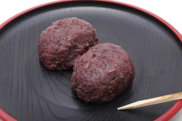 御萩是一种又被称作牡丹饼的甜糯米团,是春分和秋分时要吃的点心。将糯米和粳米混合后或蒸或炊,轻捣米饭但让部分米粒还能保持一些原型,最后裹上红豆馅。