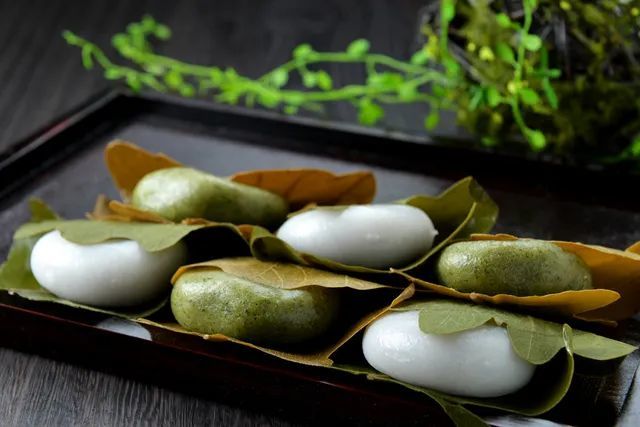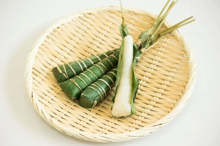 由中国传入日本,甜的粽子,外面包着竹叶。