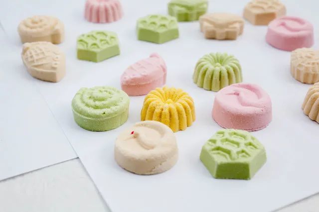 材料为糯米粉、糖和白豆或红豆,常常做成花、水果或鸟等形状以代表不同的季节。