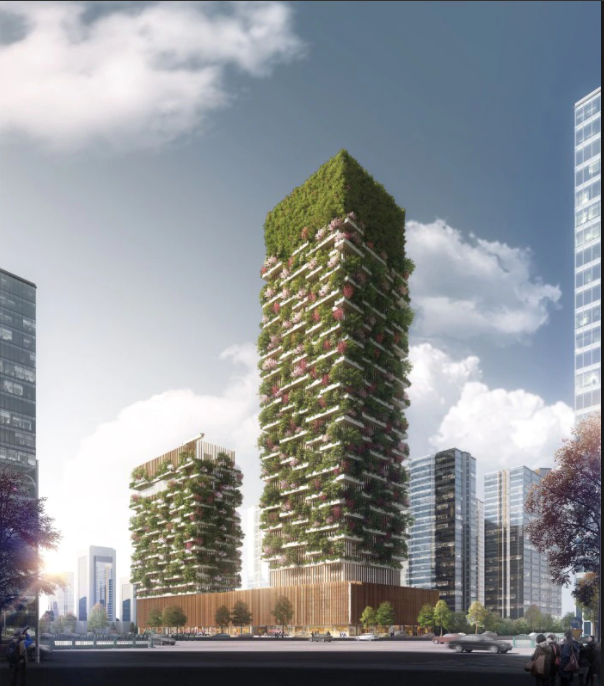 项目位于经济蓬勃发展的宁靖浦口区,包含两座塔楼:一座高200米,顶部覆盖着覆盖近5,000平方米的藤蔓、住房办公室、博物馆、绿色建筑学校和私人屋顶俱乐部 ,另一个高108米,包含一个拥有305间客房的酒店和游泳池。