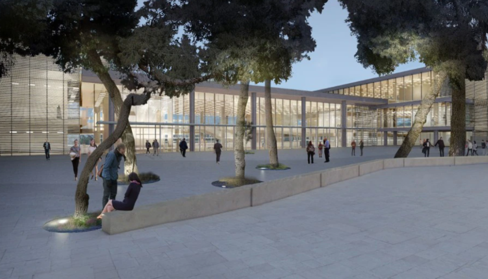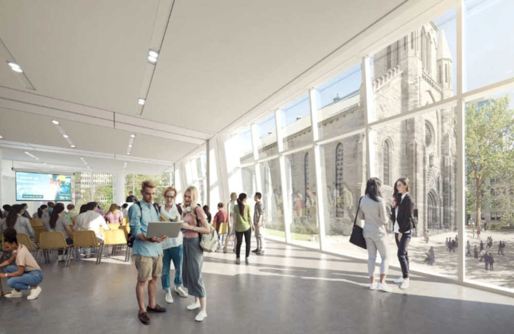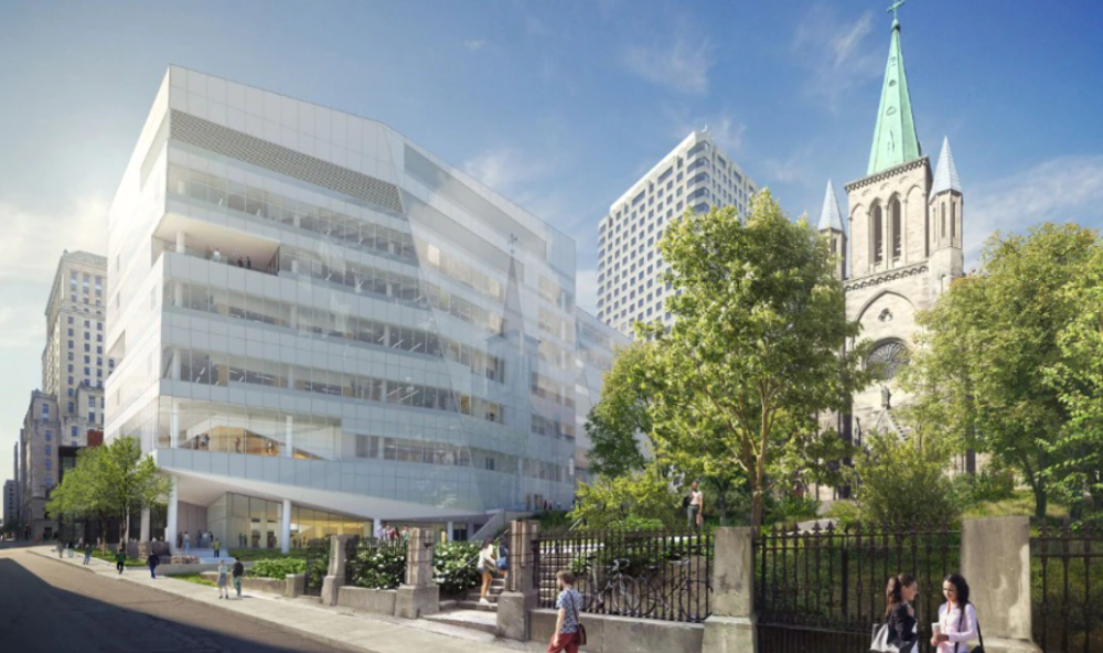 蒙特利尔新的中心枢纽大楼位于商业区、景观区和国际区的交汇处,是一个创新中心,旨在促进学校与城市商业社区之间的协同作用。它可容纳27间教室、一个300个座位的礼堂、办公室、一个人工智能研究中心和一个会议和活动空间,以及连接建筑与社区的公共设施:图书馆、咖啡馆、室内花园和庭院。