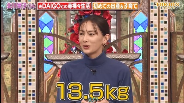 北川景子在节目中畅谈生产过程,首度透露怀孕时暴肥13.5公斤,9月宣布平安生女后,紧接着11月为电影活动登台宣传,为了亮丽现身,拼命减重。她表示刚生完宝宝后,「只瘦了2公斤」,笑笑承认怀孕因为一直吃,胖了11.5公斤,如今经过5个月,终于瘦回来。