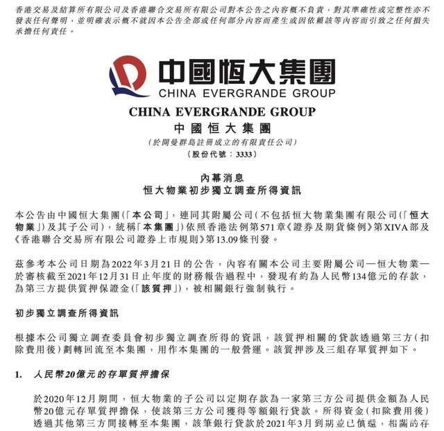 历时4个月调查,“恒大物业134亿元存款质押被相关银行强制执行”一事,终于有了初步调查结果。7月22日晚间,中国恒大(03333.HK)、恒大物业(06666.HK)同时发布公告,宣布了这一消息。
