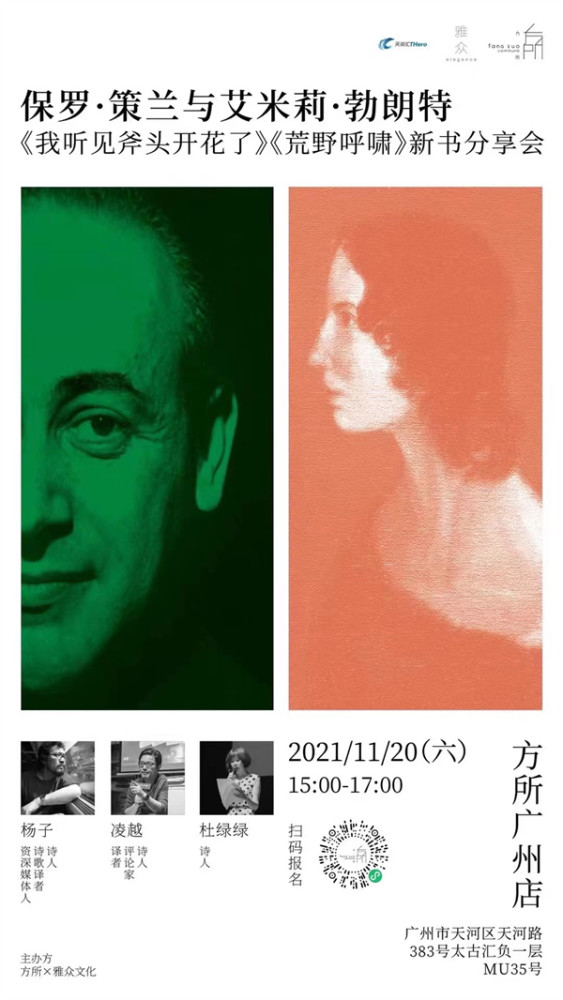 保罗·策兰与艾米莉·勃朗特——两位伟大的诗人,分别来自两个世纪、不同国家,以不同语言写作。一位是战后最重要的欧洲诗人,一位是以《呼啸山庄》闻名世界的著名勃朗特三姐妹之一。同为诗人,不同的时代、不同的语言、不同的命运……他们的诗作究竟各自有何迷人之处,又有什么相通?11月20日,杨子、凌越两位诗人、诗歌译者将携各自的新译诗集《我听见斧头开花了:保罗·策兰诗选》和《荒野呼啸:艾米莉·勃朗特诗选》,做客方所广州店,与诗人杜绿绿一起,带大家领略两位伟大诗人非凡的人生与诗歌。