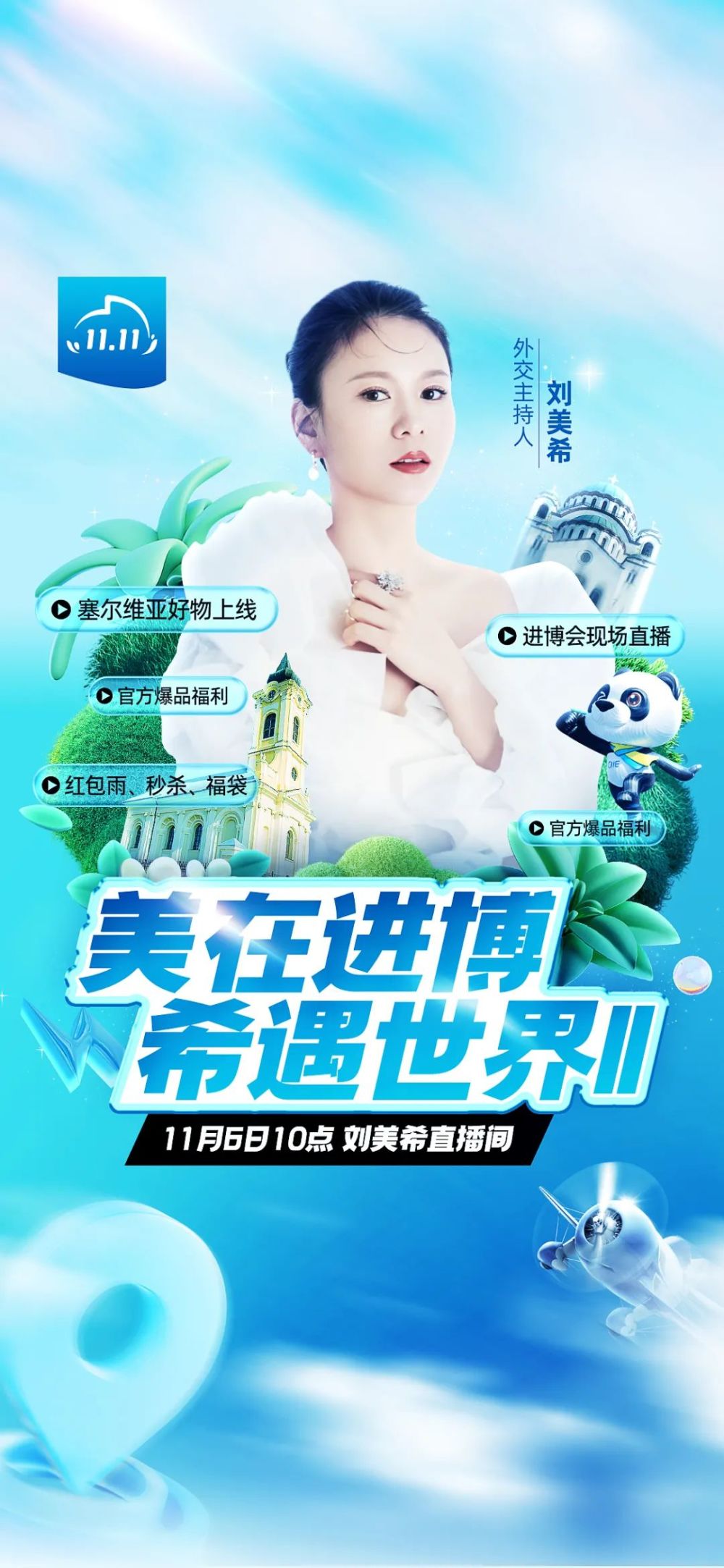 本次进博会中,刘美希主播也将为直播间用户带来塞尔维亚国家特色商品。请大家期待一下我们的直播,今年的进博会我们将全新启程,带着极度福利好物给大家火爆开播!11月6日全天时间,刘美希将不同时段为大家带来不一样的直播体验,让大家实时感受进博会的魅力,体会极致性价比!请锁定刘美希直播间,我们不见不散!