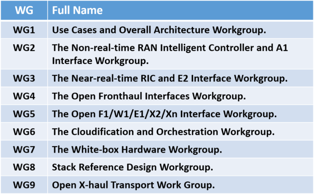 早在2018年O-RAN联盟创立的时候,为了制定开放的RAN规范标准,成立了9个小组(Work Group,WG),分别研究对应的接口和技术。