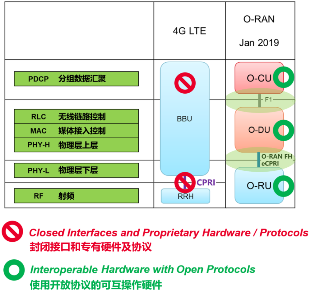 上面这张图,是5G O-RAN相比4G的主要架构变化。从图中可以看出,4G LTE RAN的主要组件BBU和RRH,变成了5G O-RAN里的O-CU、O-DU、O-RU。