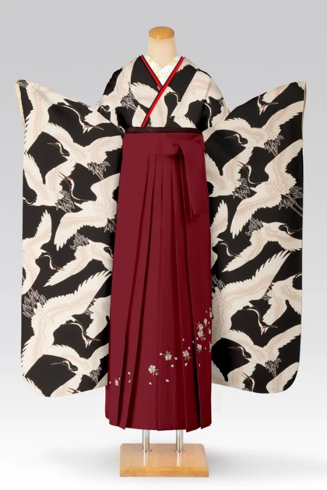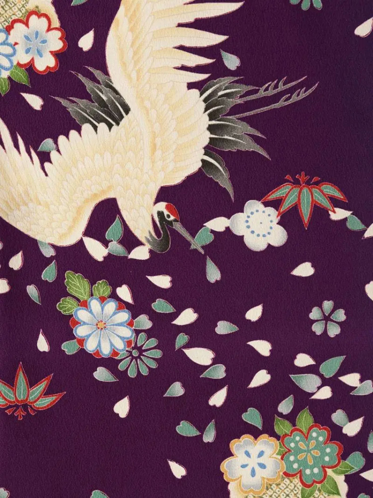 鹤在和服上一般会有两种,一种是写实的鹤的图案,另外一种是由鹤变化而来的鹤纹,相比写实的鹤,鹤纹更常见。
