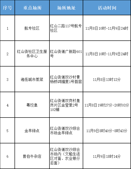 新华街道:茶园路59号、公益路卜蜂莲花广场核酸点、海王星辰健康药房(杏林分店)、杏林花园东南门生鲜特卖场连锁超市、大田路盼盼商店、商业大道(横潭市场外围鸭档、黄唐修鞋店)横潭小学、建设北路马房四街1号金雪冷冻食品经营部、惠嘉鲜生活超市(华梓达商务中心店)、金菊花小区篮球场核酸采样点;